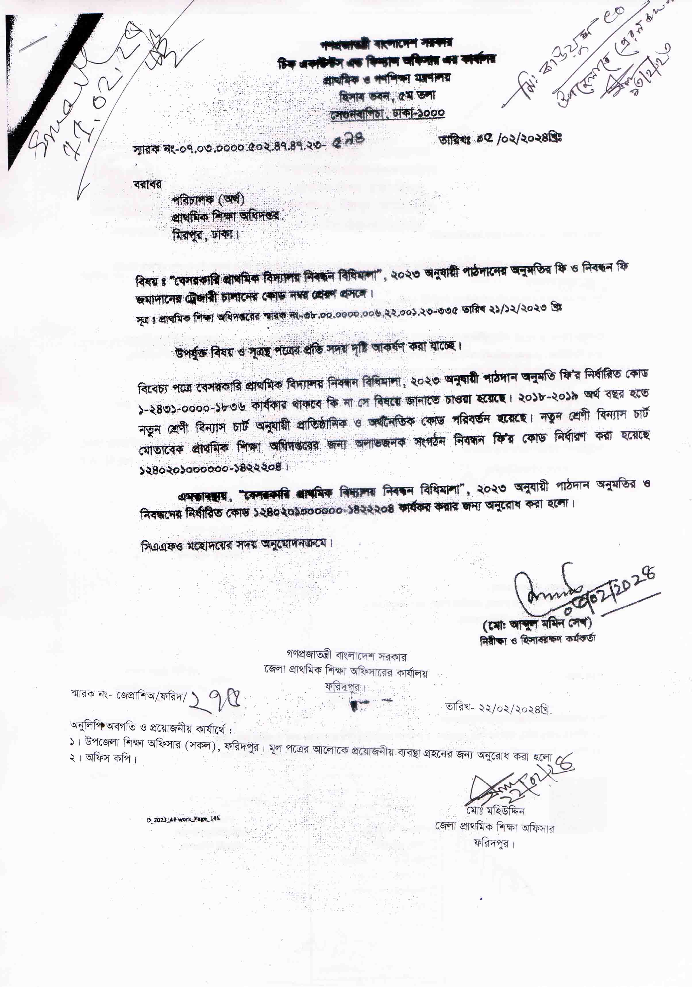 | ৮ | বেসরকারি প্রাথমিক বিদ্যালয় নিবন্ধনের জন্য পাঠদানের অনুমতি ও নিবন্ধন ফি জমাদানের ট্রেজারী চালানের কোড | | | ১১-০৮-২০২৪ | দেখুন |